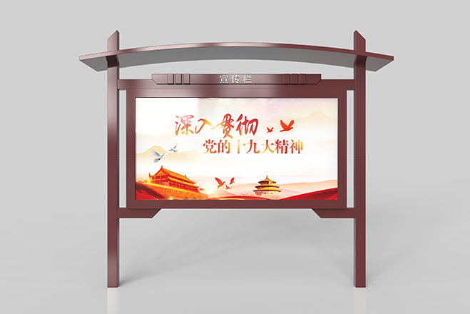 宣傳欄是一種VI應用,是組織或企業單位等進行自我宣傳的有效手段,常被應用于街道,工廠等公共場所;一般采用不銹鋼為框架,鋼化玻璃或者耐力板為面板,鋁合金為頂棚,面板可以打開更換宣傳畫面?,F如今,宣傳欄廣泛應用于學校、小區、會議館、展廳等各個場地。